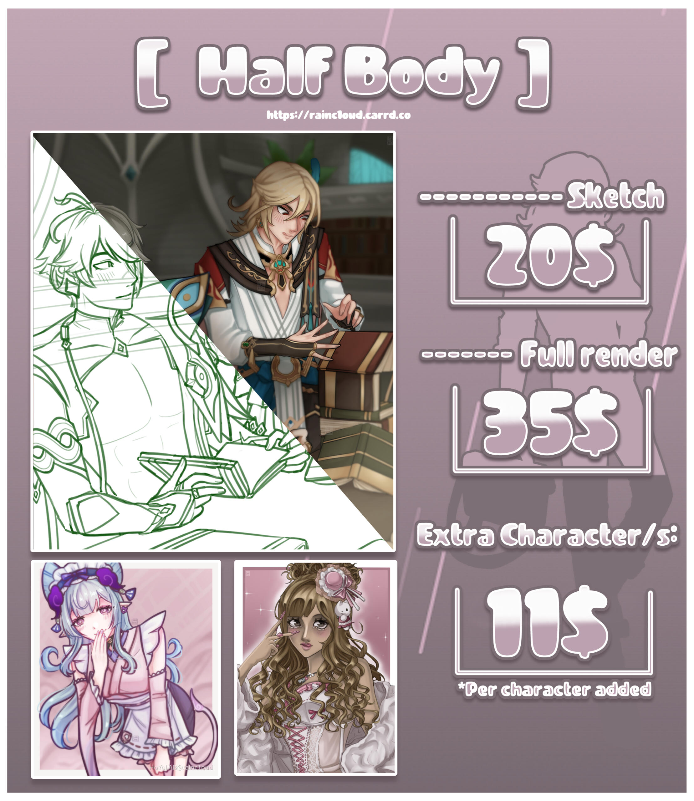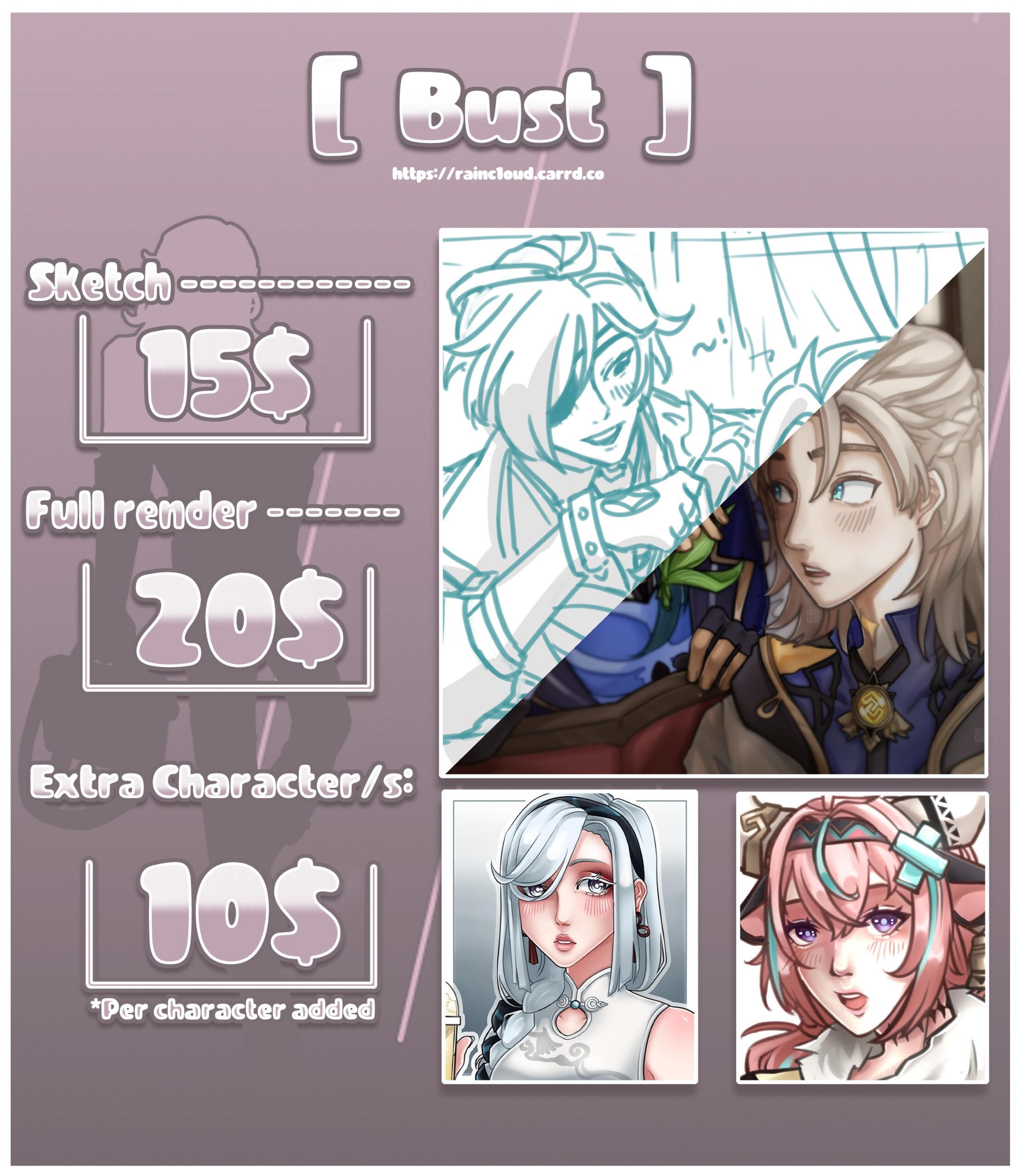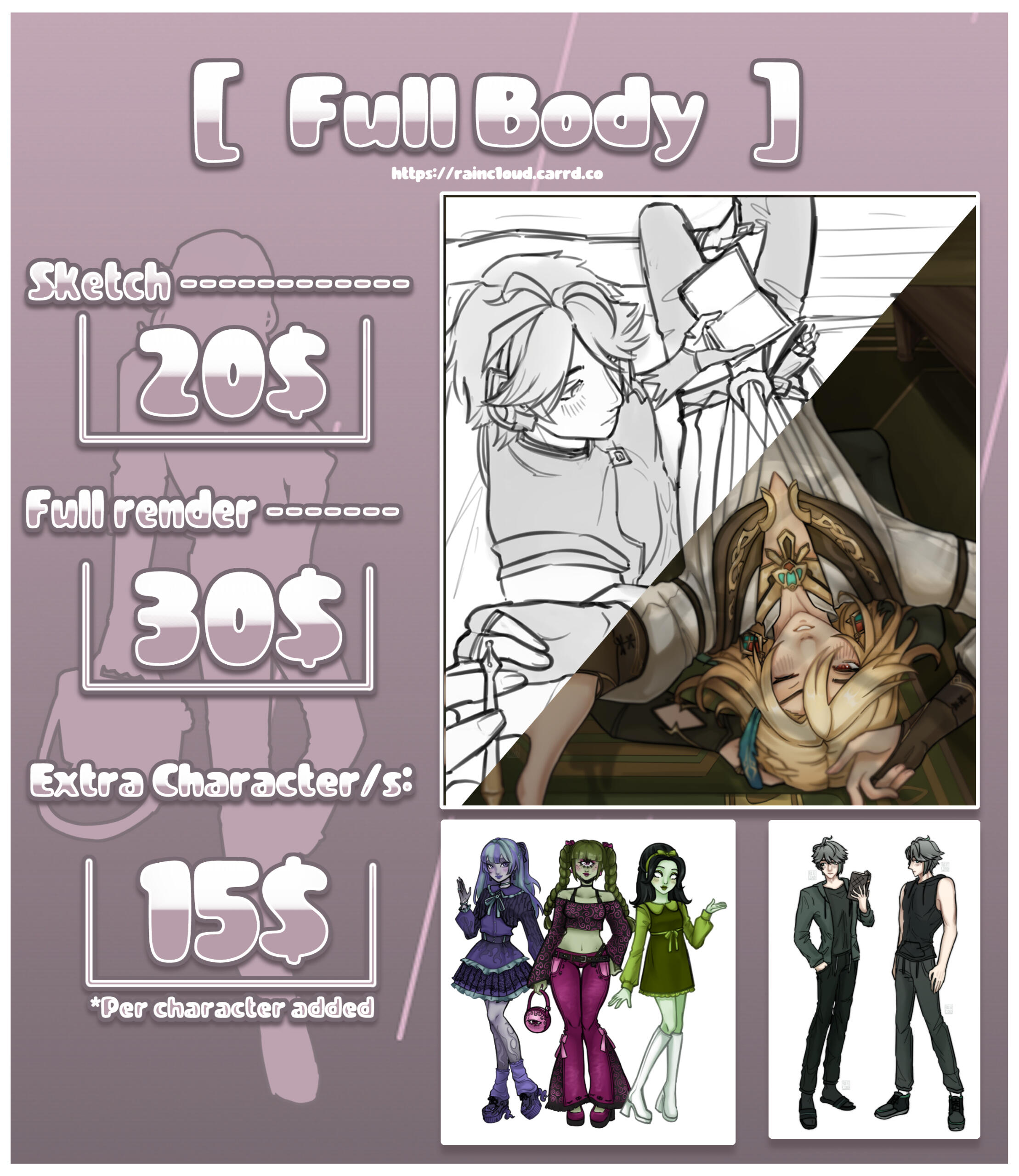 ♡ Fully Colored: 20$♡ Sketch: 15$♡ Extra Pet: +10$ per